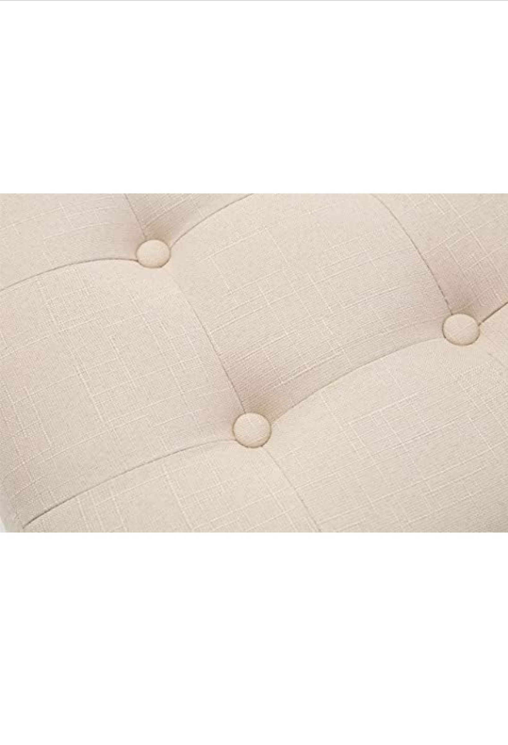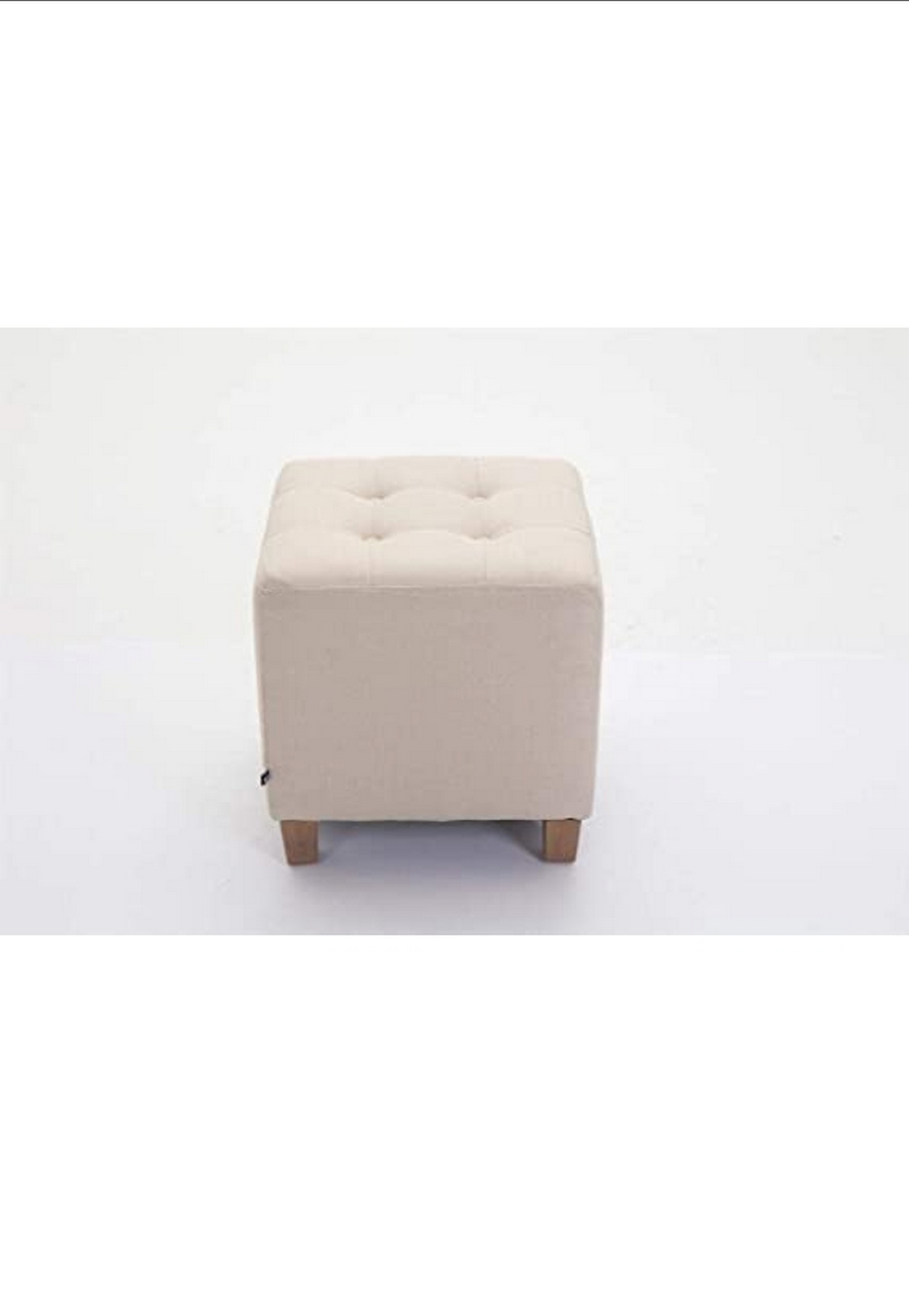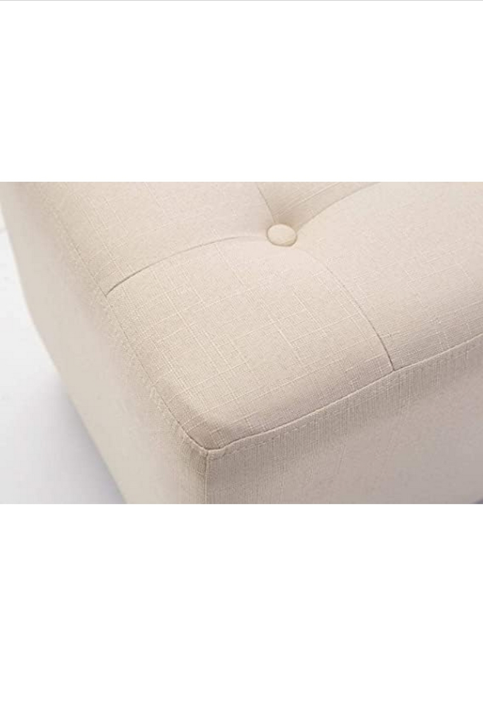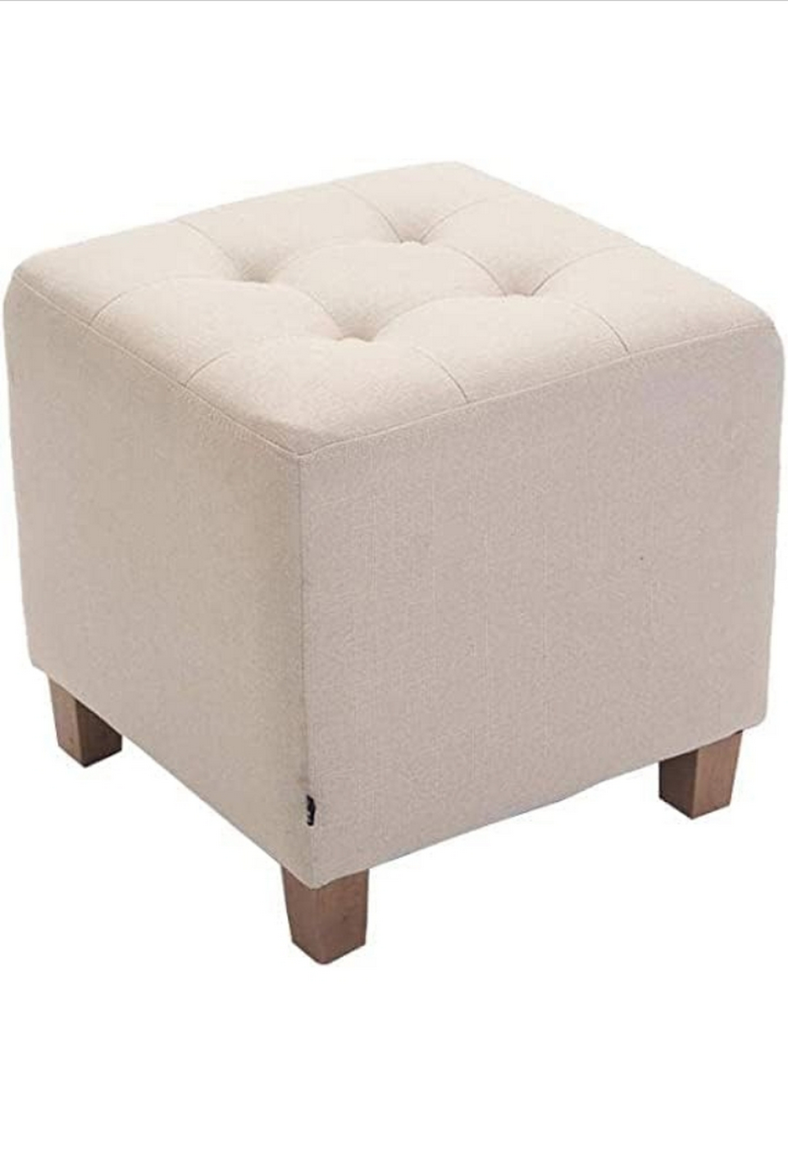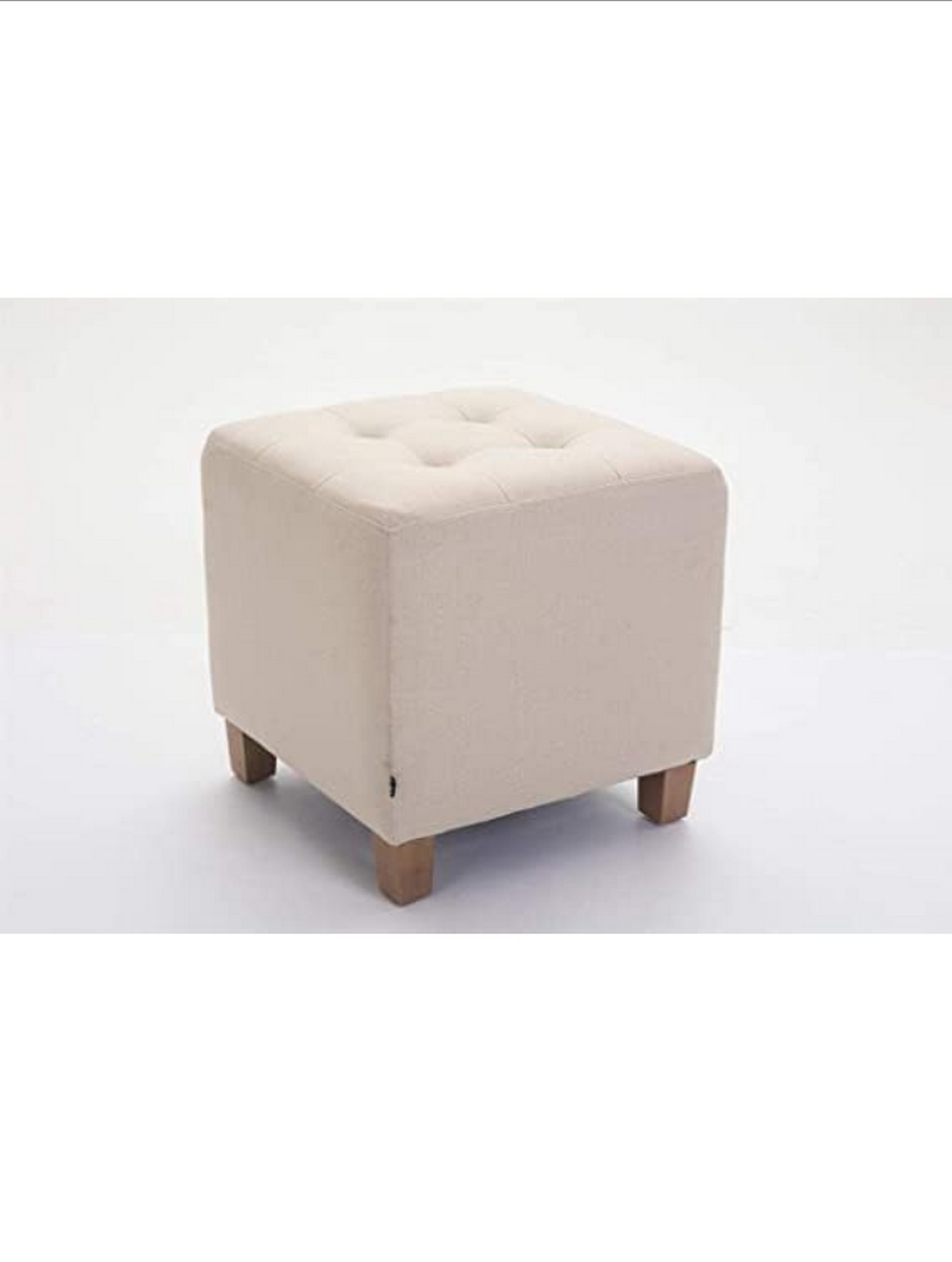 A timeless cream fabric tufted square puffy stool by Modern India Seating, featuring wooden legs. Offers versatile style and comfortable extra seating or footrest.